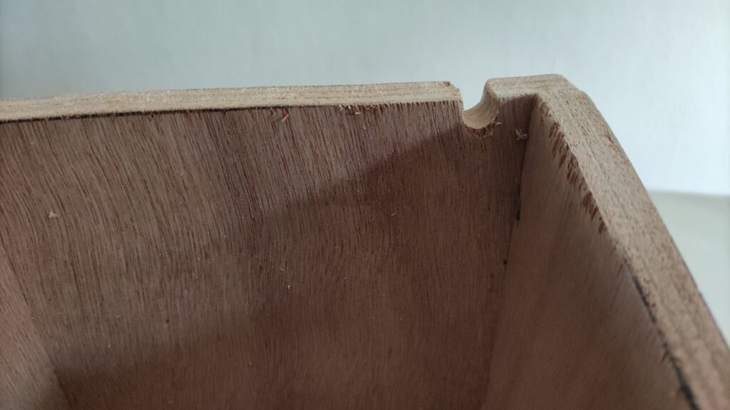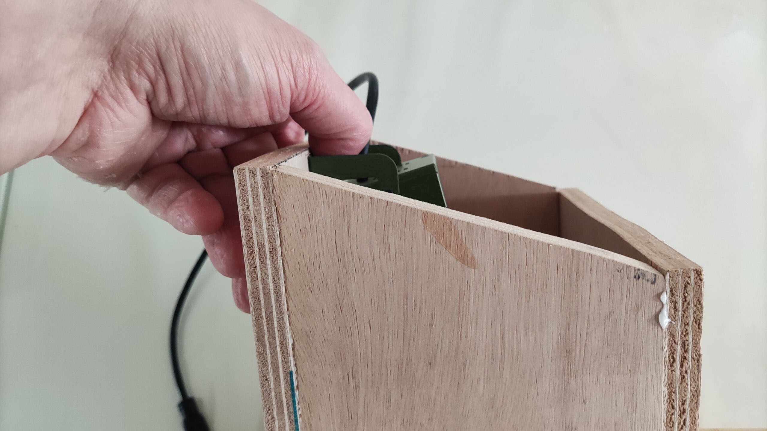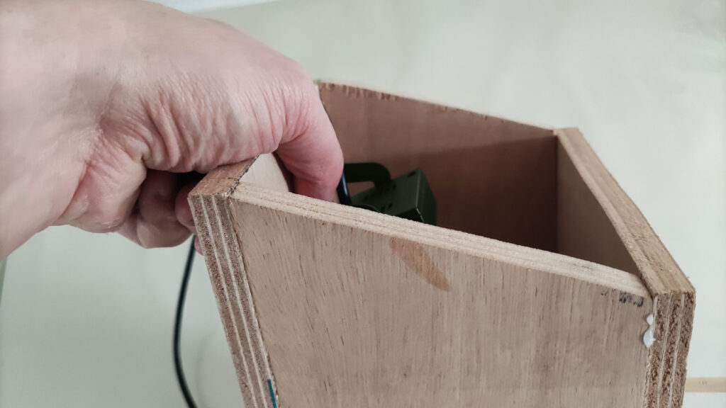 - Maak nu een kleine inkeping in de achterwand van het huisje, ter hoogte van het dak. Hier gaat de kabel van de camera straks doorheen.