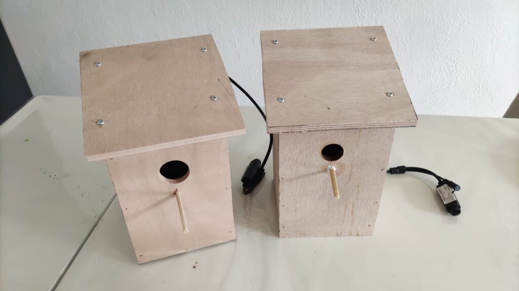 - Bepaal waar de camera komt. Let erop dat deze niet boven het vogelhuisje uitsteekt. Houdt een klein beetje afstand tussen het dak en de camera (+- 2 cm). Zet de camera vast met twee schroefjes.